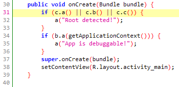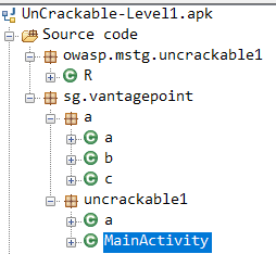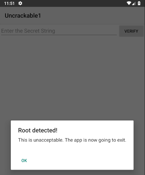 If any of those functions return true, the app will call sg.vantagepoint.uncrackable1.MainActivity.a(), which will tell us that the app is rooted/debuggable and will exit upon clicking OK like we see at the beginning of the post.