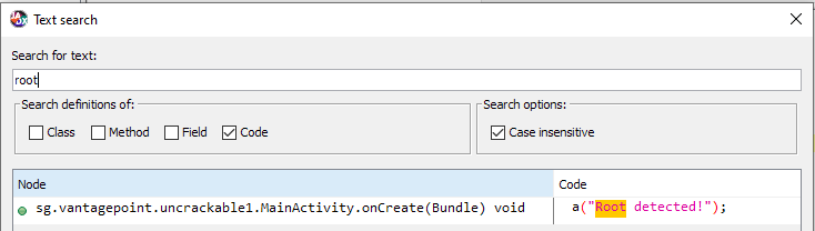 The search tell us that there’s a “root” string in sg.vantagepoint.uncrackable1.MainActivity.onCreate(), this function will check to see if the device is rooted and the app is debuggable: