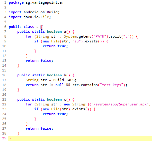 The check is done by class sg.vantagepoint.a.c, function a(), b() and c(), these function will return true if the checks indicates that the device is rooted and false otherwise:
