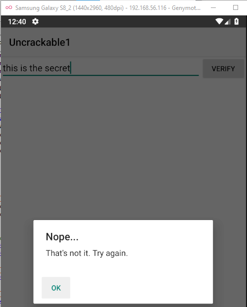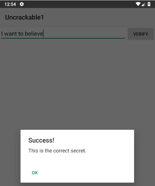 The application use sg.vantagepoint.uncrackable1.MainActivity.verify() to verify the entered secret.