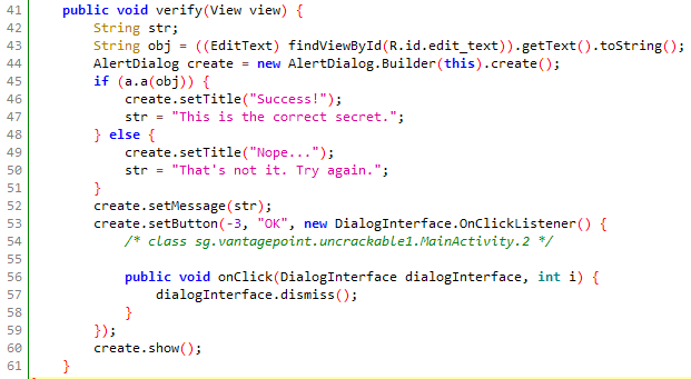 We can clearly see that the string we enterted into the textbox is stored in the obj string variable, which is then passed to sg.vantagepoint.uncrackable1.a.a() in the if condition, we can safely conclude that this function will return true if the secret is correct.
