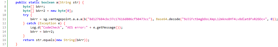 Our string is compared to a string represented by the variable bArr. The value of bArr is calculated with a function call to sg.vantagepoint.a.a.a(byte[] bArr, byte[] bArr2) with some encoding shenanigans happening, we won’t need to bother with figuring out how the function works, as we are going to hook the function to get the byte array that the function returns with this snippet: