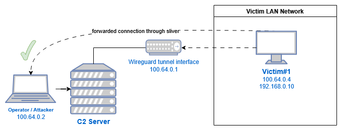 On the Sliver server and on the victim machine, the wireguard connection is not exposed as a network interface, it lives entirely inside the process.
