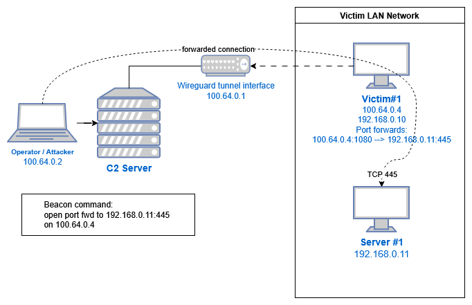 Operators that use Wireguard protocol transport and port forwarding to access implants.