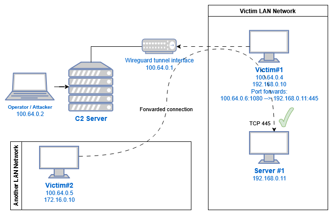 If the operator has set up port forwarding to access services inside a victim’s internal network, something like 100.64.0.4:1080 –> internal-ad-server.corp.local:445